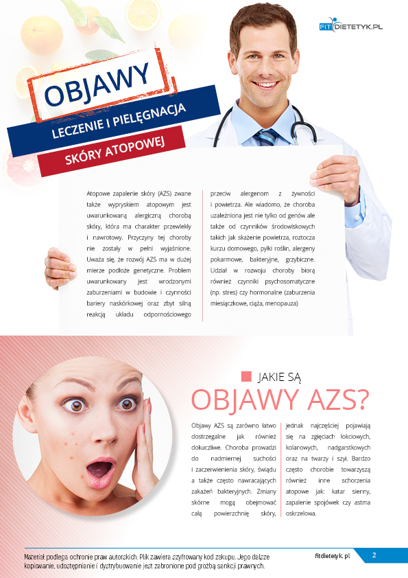 Opracowanie zawiera zbiór niezwykle ważnych informacji dla osób borykających się z atopowym zapaleniem skóry. Dodatkowo przygotowano dwa 7-dniowe jadłospisy dla dzieci i osób dorosłych. Program dietetyczny został opracowany przez zespół dietetyków specjalizujących się w leczeniu żywieniowym chorób skóry. W diecie zadbano o najważniejsze potrzeby żywieniowe z jednoczesnym ograniczeniem produktów  zaostrzających AZS.