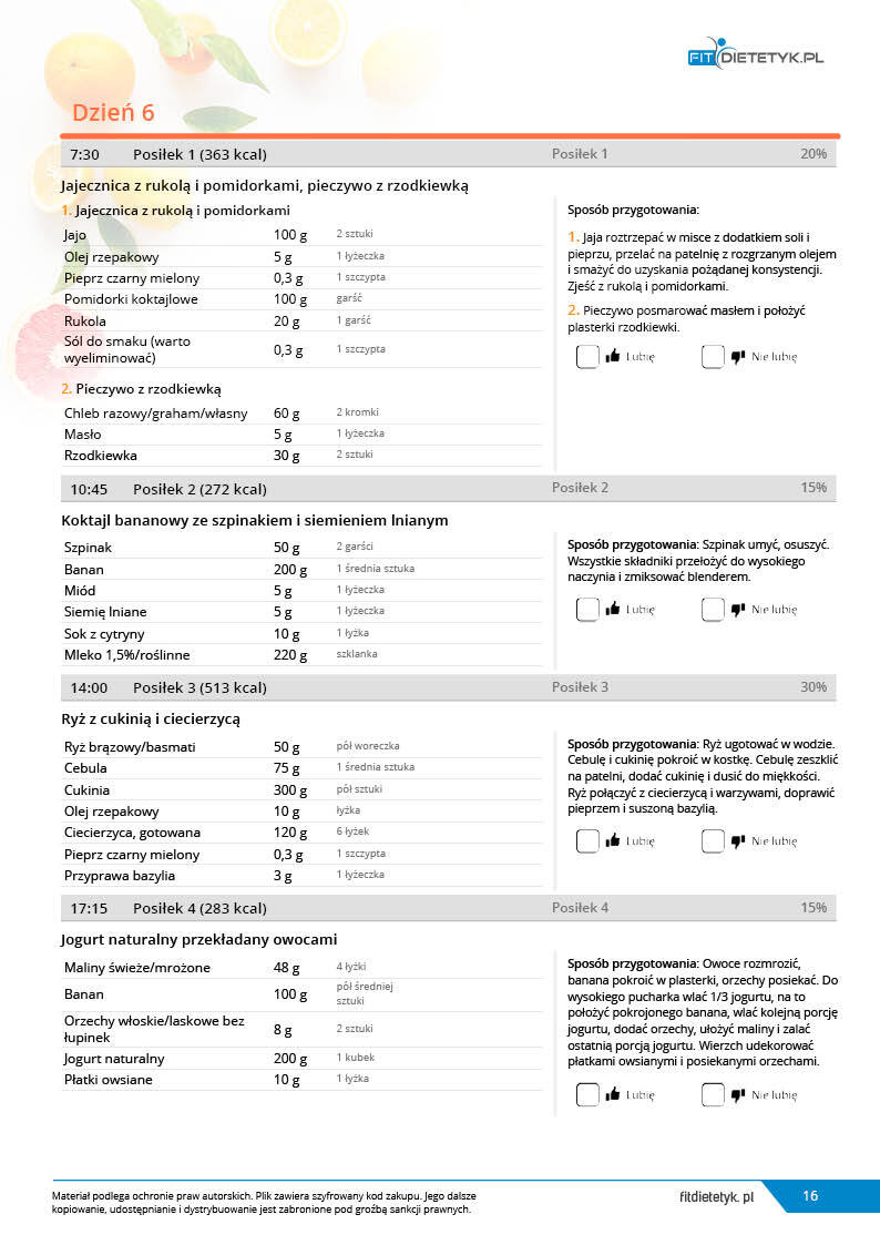 w formie propozycji posiłków (zamiast pojedynczych jadłospisów jednodniowych, przygotowano propozycje kilku propozycji dań na każdy posiłek). Tutaj nie uzależniamy Cię od tego jakie masz np. w danym dniu zjeść śniadanie czy obiad, tylko sam wybierasz sobie ulubione danie z kilku przedstawionych przez nas propozycji.