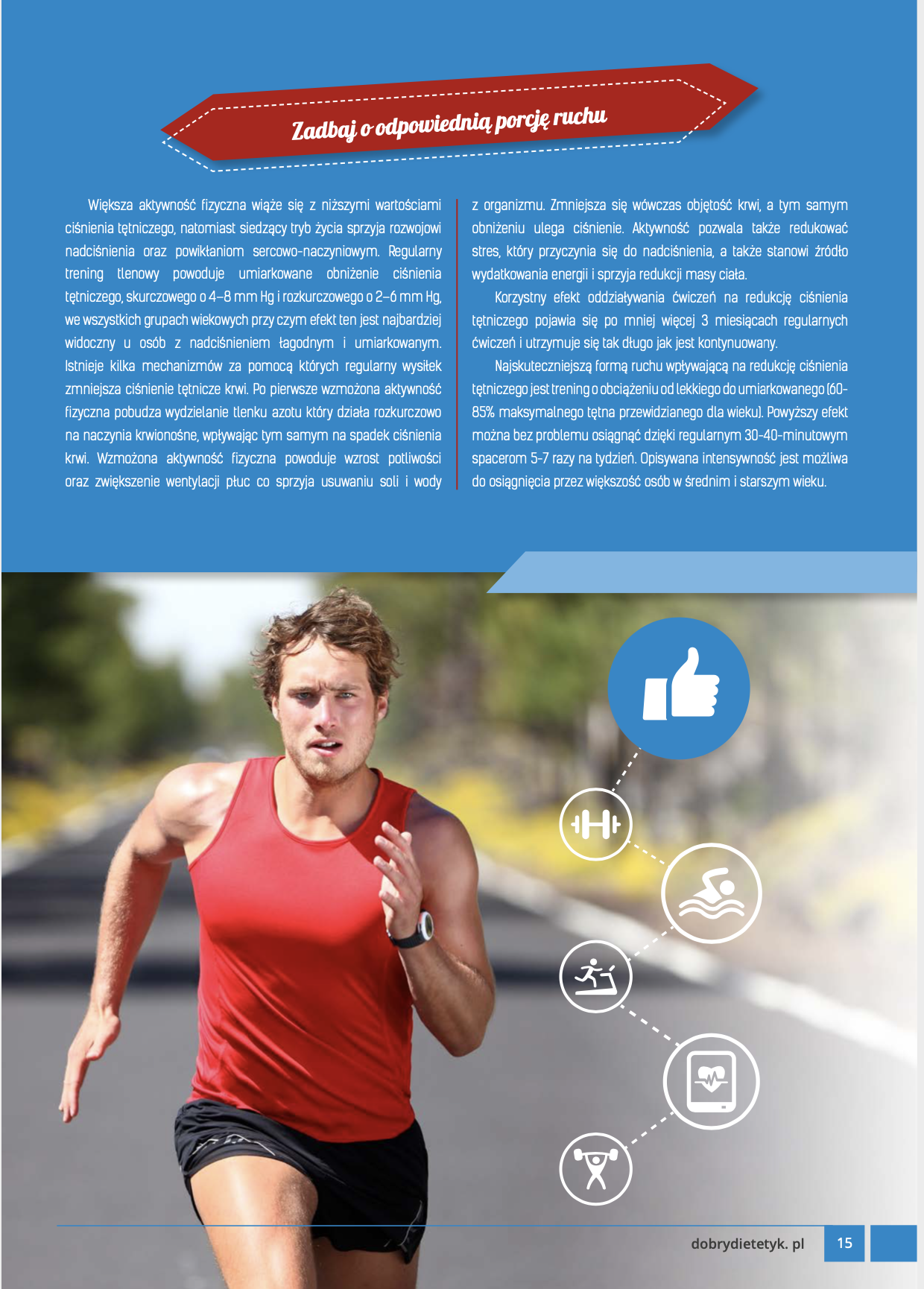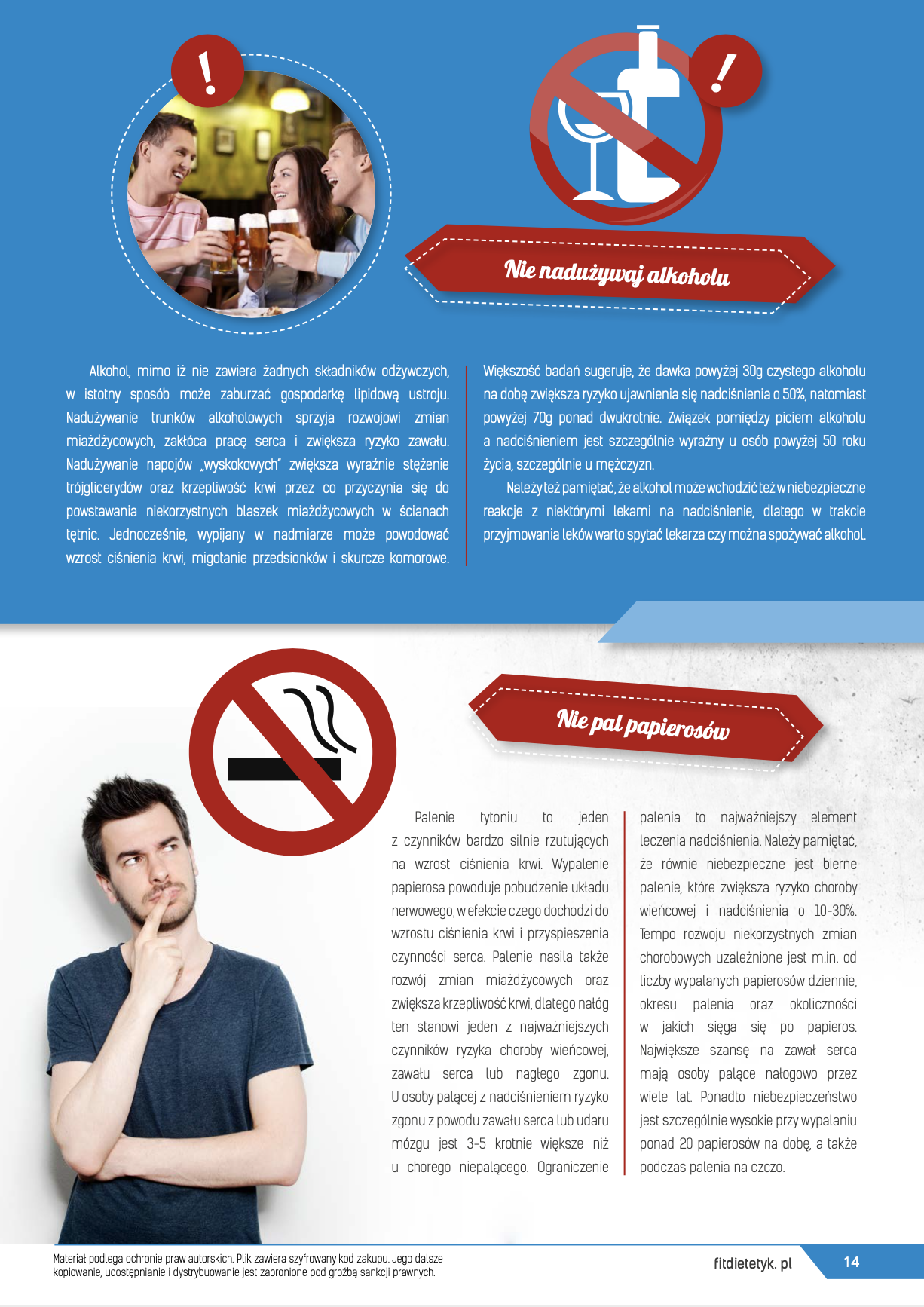 Kompleksowy program żywieniowy dla MĘŻCZYZNzmagających się z problemem nadciśnienia tętniczego. Opracowanie zawiera specjalnie przygotowany przewodnik edukacyjny oraz 30-dniowy jadłospiswspomagający redukcję podwyższonego ciśnienia krwi. W diecie zwrócono szczególną uwagę na podaż składników odżywczych wpływających na relaksację i zdrowie naczyń krwionośnych. Obok uwzględnienia ogólnych potrzeb żywieniowych mężczyzn, zadbano m.in. o podaż odpowiedniej ilości sodu potasu, zachowanie odpowiednich proporcji między tymi składnikami a także dostarczenie zwiększonej ilości kwasów omega-3, które wpływają na procesy rozkurczowe naczyń krwionośnych. W przygotowanej diecie zwrócono także uwagę na ograniczenie podaży składników o działaniu miażdżycorodnym a także zwiększono podaż witamin chroniących naczynia krwionośne przed uszkodzeniem. Dieta sprawdzi się także idealnie w programach redukcji wagi u mężczyzn, w chorobach układu krążenia a także jako dieta po zawale.