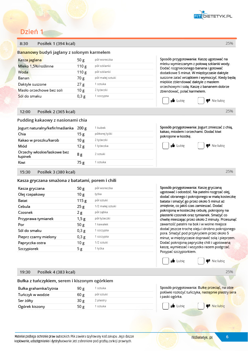 w formie propozycji posiłków (zamiast pojedynczych jadłospisów jednodniowych, przygotowano propozycje kilku propozycji dań na każdy posiłek). Tutaj nie uzależniamy Cię od tego jakie masz np. w danym dniu zjeść śniadanie czy obiad, tylko sam wybierasz sobie ulubione danie z kilku przedstawionych przez nas propozycji.