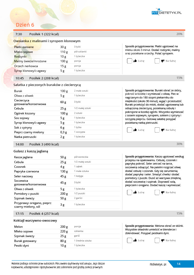 w formie propozycji posiłków (zamiast pojedynczych jadłospisów jednodniowych, przygotowano propozycje kilku propozycji dań na każdy posiłek). Tutaj nie uzależniamy Cię od tego jakie masz np. w danym dniu zjeść śniadanie czy obiad, tylko sam wybierasz sobie ulubione danie z kilku przedstawionych przez nas propozycji.